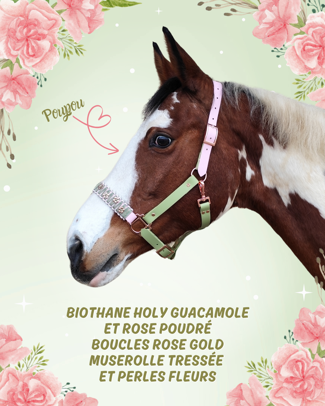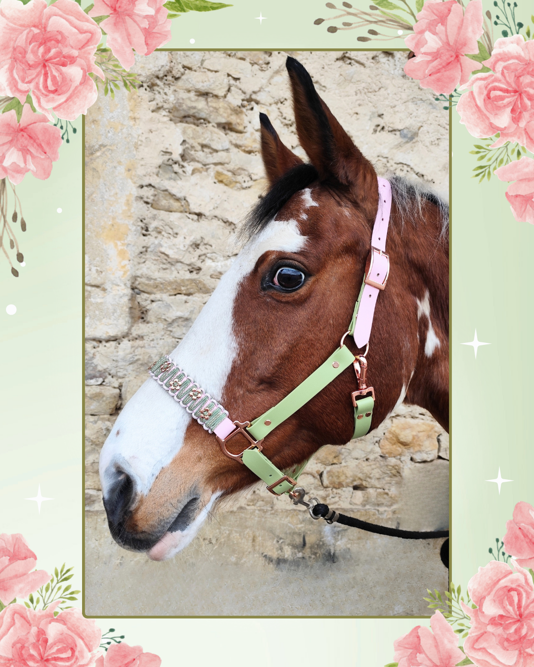 Plein de fraîcheur et délicieusement romantique, Baby Flower est le licol qui fait fondre au premier regard. Un licol en Biothane tout en douceur, avec un duo de couleurs tendre et harmonieux : Holy Guacamole (vert lumineux) et rose poudré, sublimés par une bouclerie rose gold qui apporte une touche précieuse et raffinée.