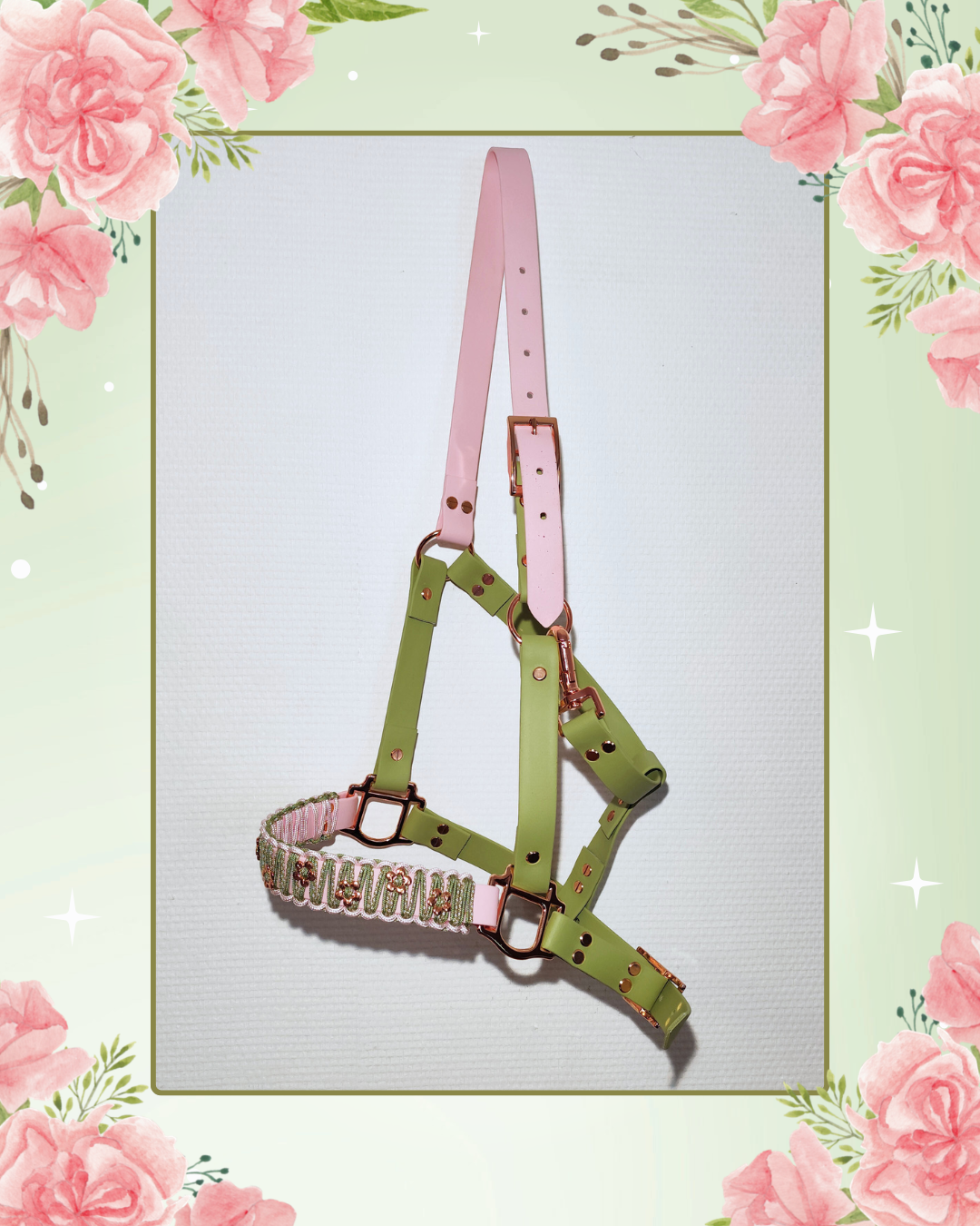 Licol Biothane “Baby Flower” – Holy Guacamole & Rose poudré – Bouclerie Rose Gold – Muserolle tressée & perles fleuries – Taille PS