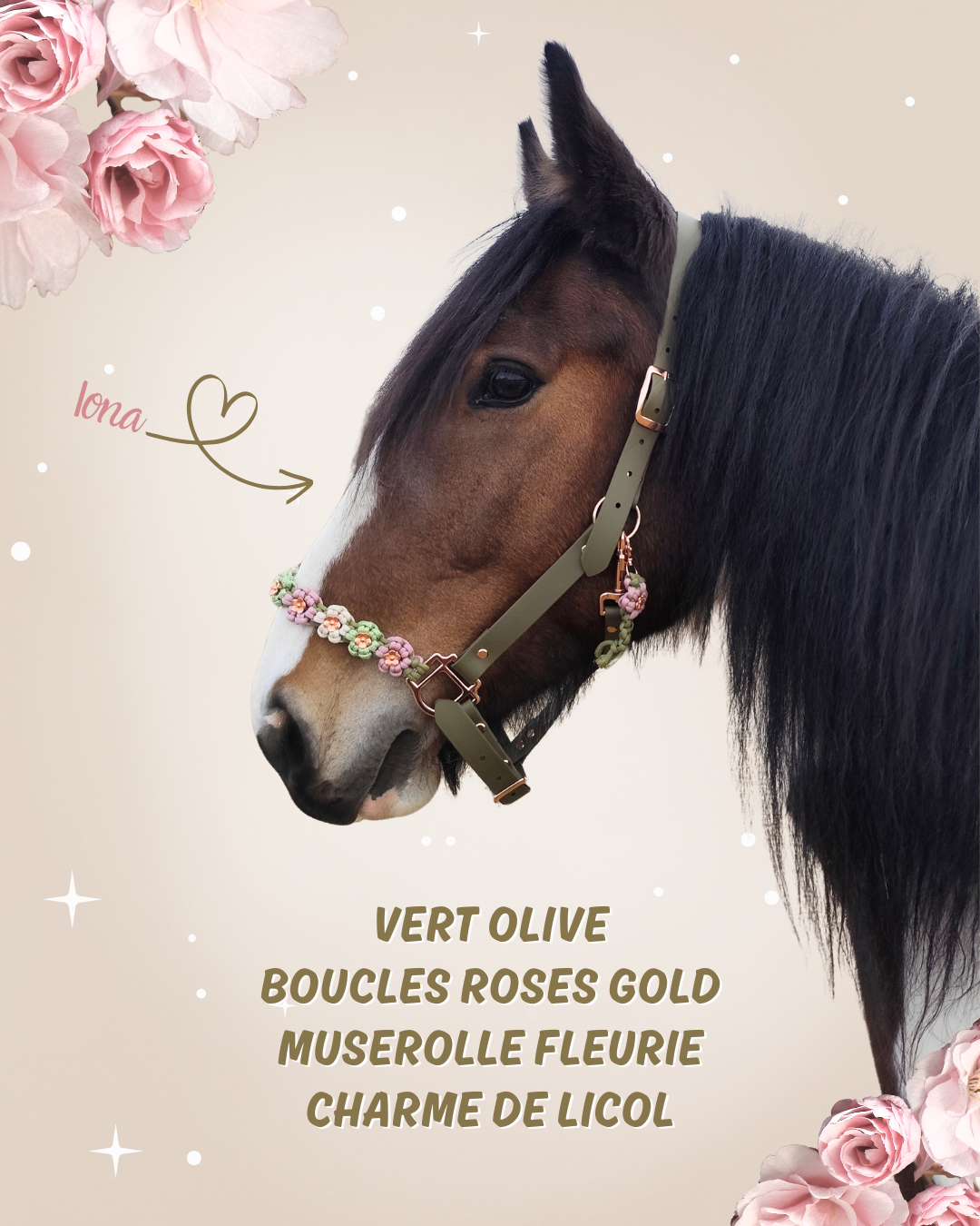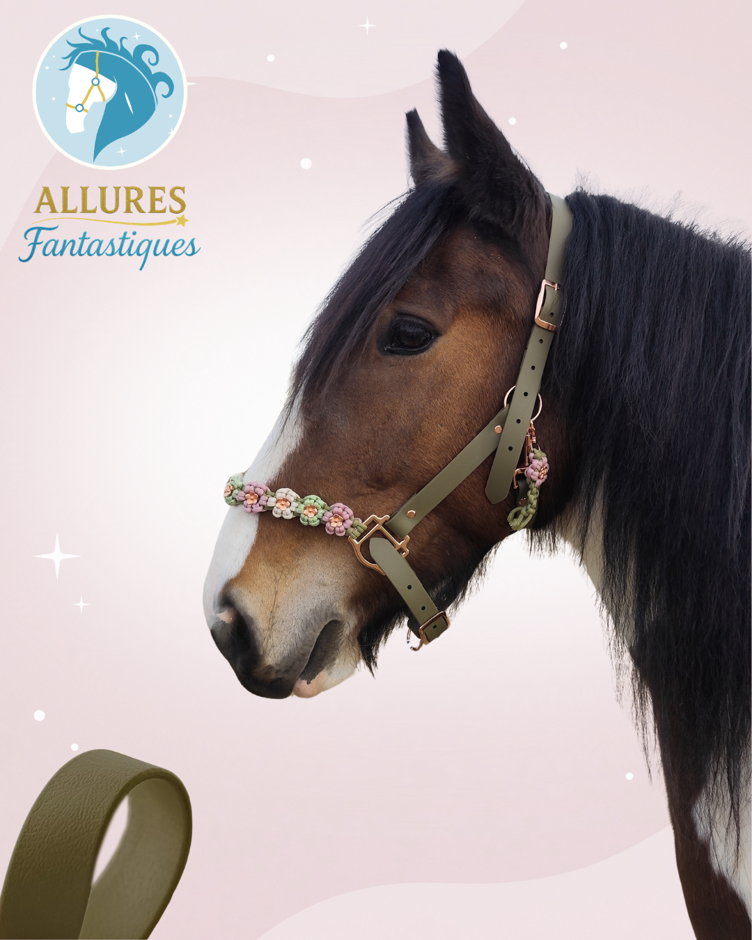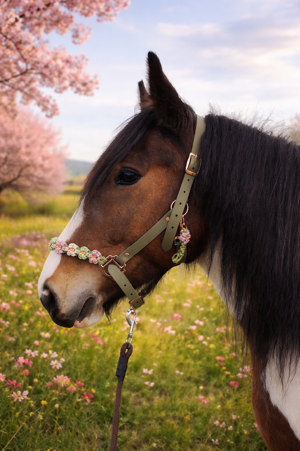 Sa couleur Military Olive, profonde et stable, contraste avec un tressage fleuri en paracorde agrémenté de perles, comme un murmure posé sur un vert intense. Un licol pour les chevaux qui avancent avec assurance… et une élégance tranquille.