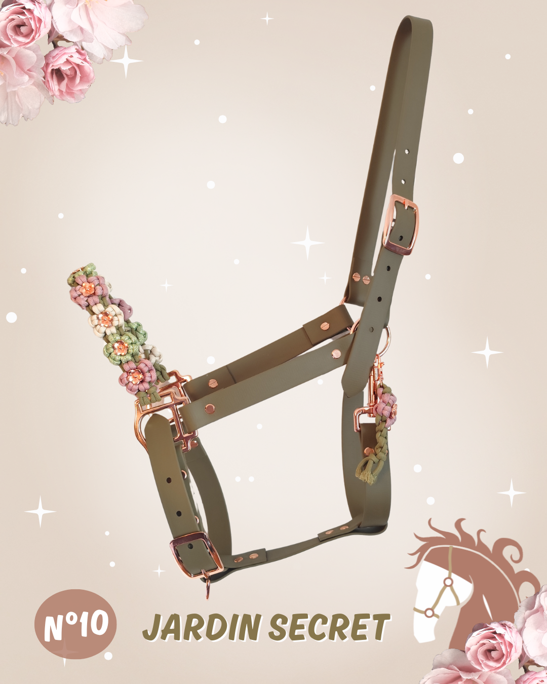 À la frontière entre la sobriété du Biothane et la finesse d’un tressage en paracorde, Jardin Secret est un licol qui joue l’équilibre parfait : solide, délicat, et incroyablement élégant. Matière et détail se rencontrent pour créer une pièce au caractère affirmé, tout en gardant une douceur florale dans les finitions.