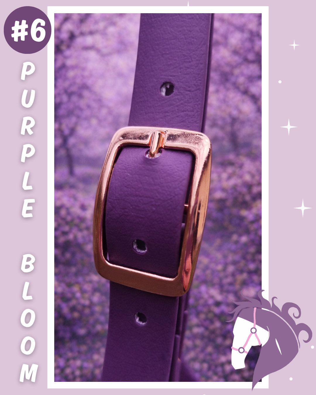 Offre à ton cheval un look élégant et lumineux avec Purple Bloom, un licol en Biothane aux tons aubergine et violet pastel, sublimé par une bouclerie rose gold. Une pièce raffinée, inspirée des soirées d’été et des fleurs qui s’ouvrent à la tombée du jour… parfait pour se démarquer avec subtilité, sans en faire trop.